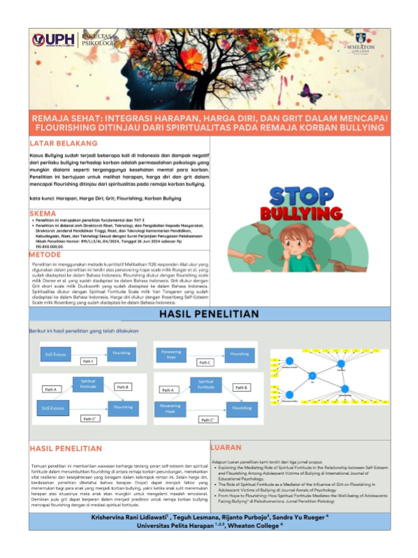 Penelitian yang berjudul “Remaja Sehat Jiwa: Integrasi Harapan, Harga Diri, dan Grit dalam Mencapai Flourishing Ditinjau dari Spiritualitas pada Remaja Korban Bullying” merupakan penelitian yang dibiayai oleh Kementerian Pendidikan Tinggi, Sains, dan Teknologi Tahun Anggaran 2024. Penelitian ini dilaksanakan oleh sebuah tim yang diketuai oleh Krishervina Rani Lidiawati dengan anggota Teguh Lesmana, Rijanto Purbojo, dan Sandra Yu Rueger dari Wheaton College, AS, di bawah koordinasi Lembaga Penelitian dan Pengabdian kepada Masyarakat (LPPM) Universitas Pelita Harapan. Fokus penelitian ini adalah untuk mengkaji faktor-faktor psikologis yang dapat mendukung kesejahteraan mental (flourishing) pada remaja yang pernah menjadi korban perilaku perundungan (bullying).